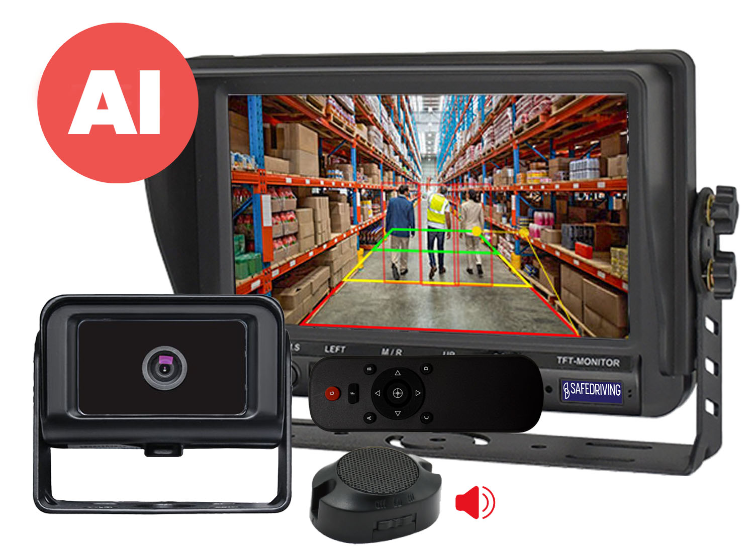 AI kamerasystem med 7” HD-monitor och AI-kamera för detektering av fotgängare och fordon. Varningszon och backhjälplinjer kan enkelt justeras med fjärrkontroll för att passa olika fordon och monteringshöjd. Byggt för tuffa miljöer med IP68/IP69K och driftspänning DC 11–32V.